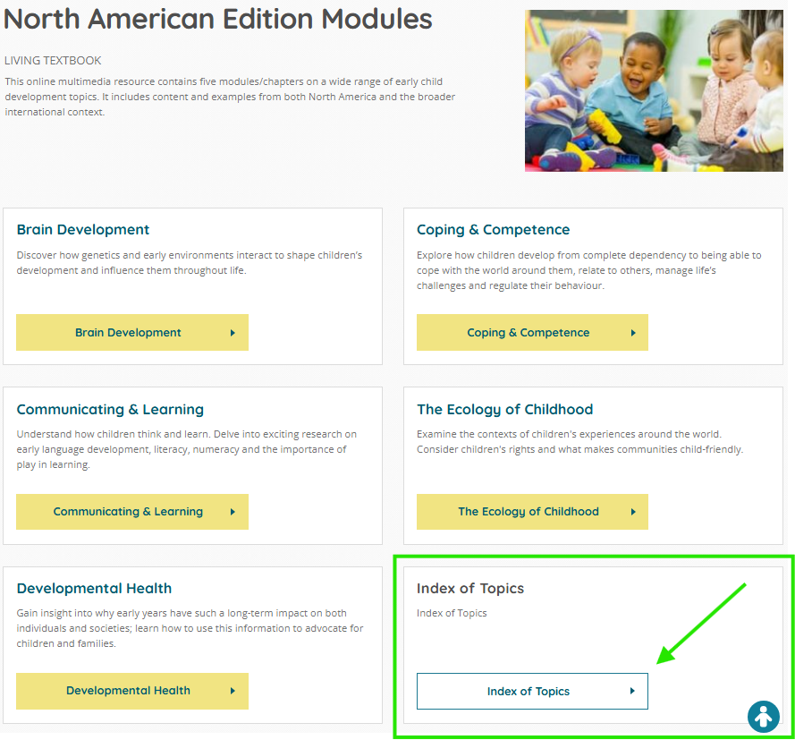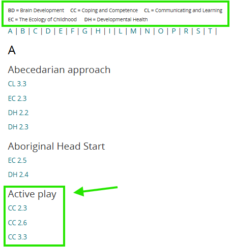 The Index of Topics can be found on the landing page of the North American Edition. Use the index to search for a topic of interest. For example, if you are wondering about the benefits of Active Play, the Index of Topics lists three SECD pages with information.