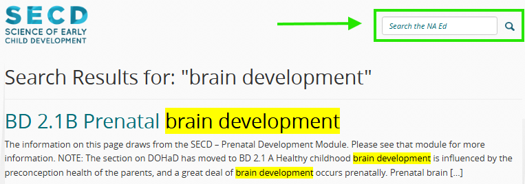 Find information on a topic using the search function found in the upper right corner of each SECD webpage. Try to be specific with the name or term that you are looking for. Using quotation marks around the term/name will focus your search to the SECD webpages with that exact text. For example, the following search in SECD – North American Edition for the term “brain development” (using quotation marks), shows SECD pages that contain the exact term.