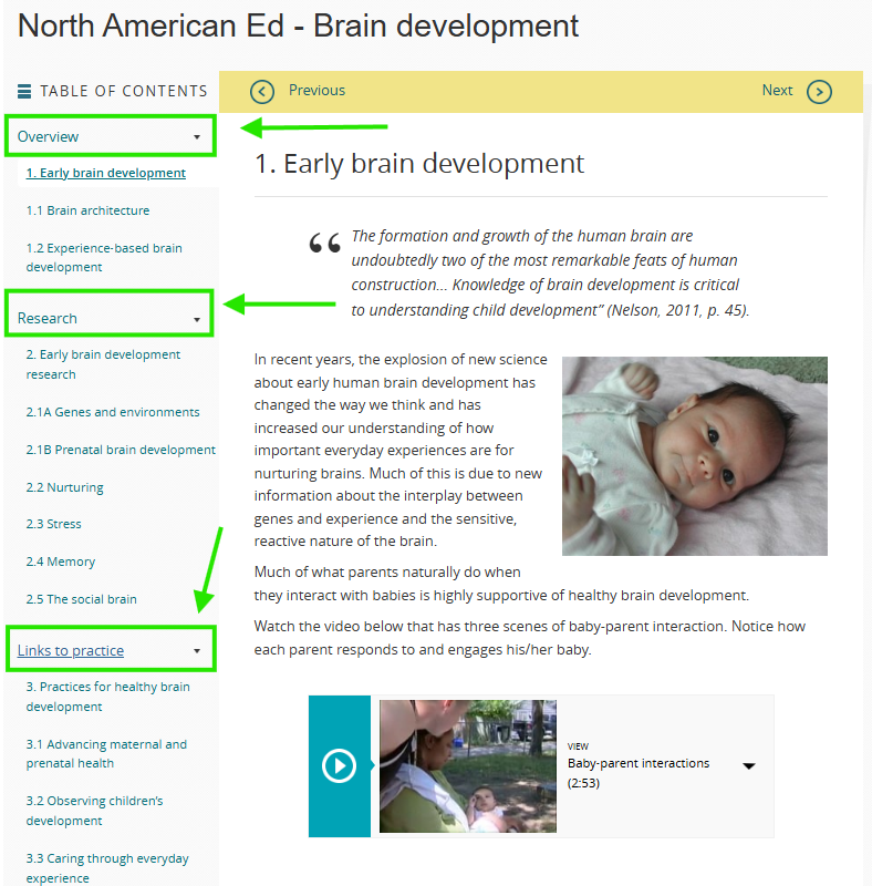 When you access any of the SECD resources, you will see the table of contents either at the top or on the left margin. The modules in the NA and Intro Editions each have three sections: Overview, Research, and Links to practice. The Child Development Primer has eight topic pages.